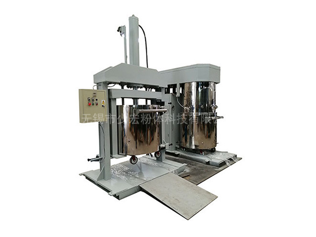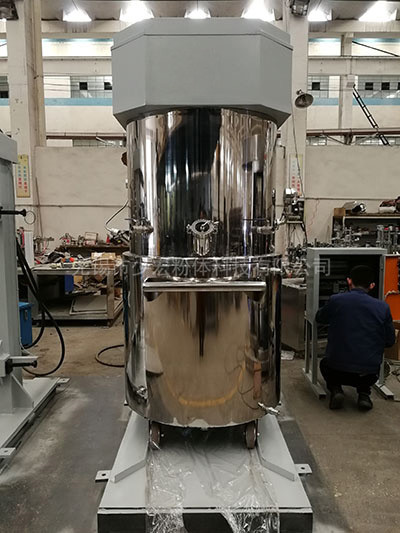 行星架轉動時,帶動箱內的三根攪拌、分散軸圍繞料桶軸線公轉的同時高速自轉,從而使物料受到強烈的剪切、捏合作用,達到充分分散和混合的目的;在行星架上有一刮壁刀隨行星架轉動,緊貼桶壁不斷的刮拭,使桶壁無滯留料,提高混合效果。攪拌時間的長短根據物料的屬性的不同由用戶掌握,可通過控制面板調節。封蓋及行星攪拌器由雙柱液壓升降,操作平隱、快捷、輕便。